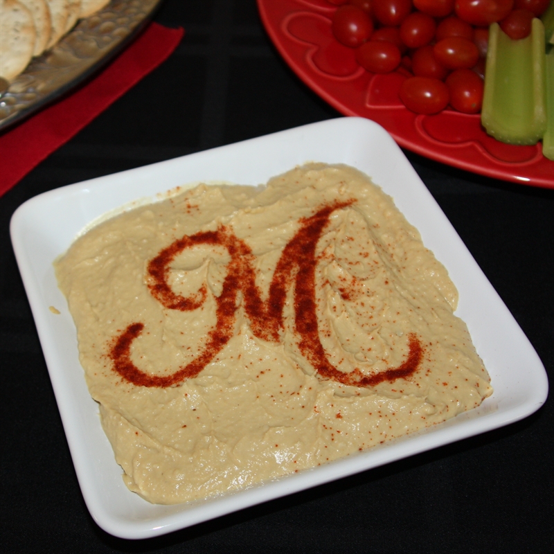 To do this, I started by spreading my hummus and giving it a fairly flat surface. I then took some heavy paper and cut out a large M (using the Creative Memories Divine Wedding cartridge). Instead of using the shape that the Cricut cut out, I used the outside (the negative of the shape) as a stencil. I placed this gently over my hummus and sprinkled some paprika over the opening. I carefully lifted up the paper and was left with the above result. Pretty fun for a last minute idea 10 minutes before I ran out the door to the shower!