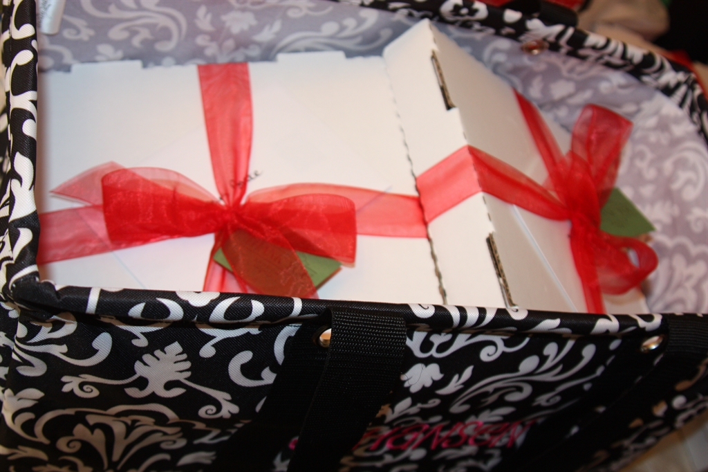 In the early years of trying to figure out how to package the cookies for the teachers I stumbled across the idea of plain pizza boxes and this is now my signature presentation. I order them from my favorite website – Papermart. I add a bow and a tag or label and I am good to go…