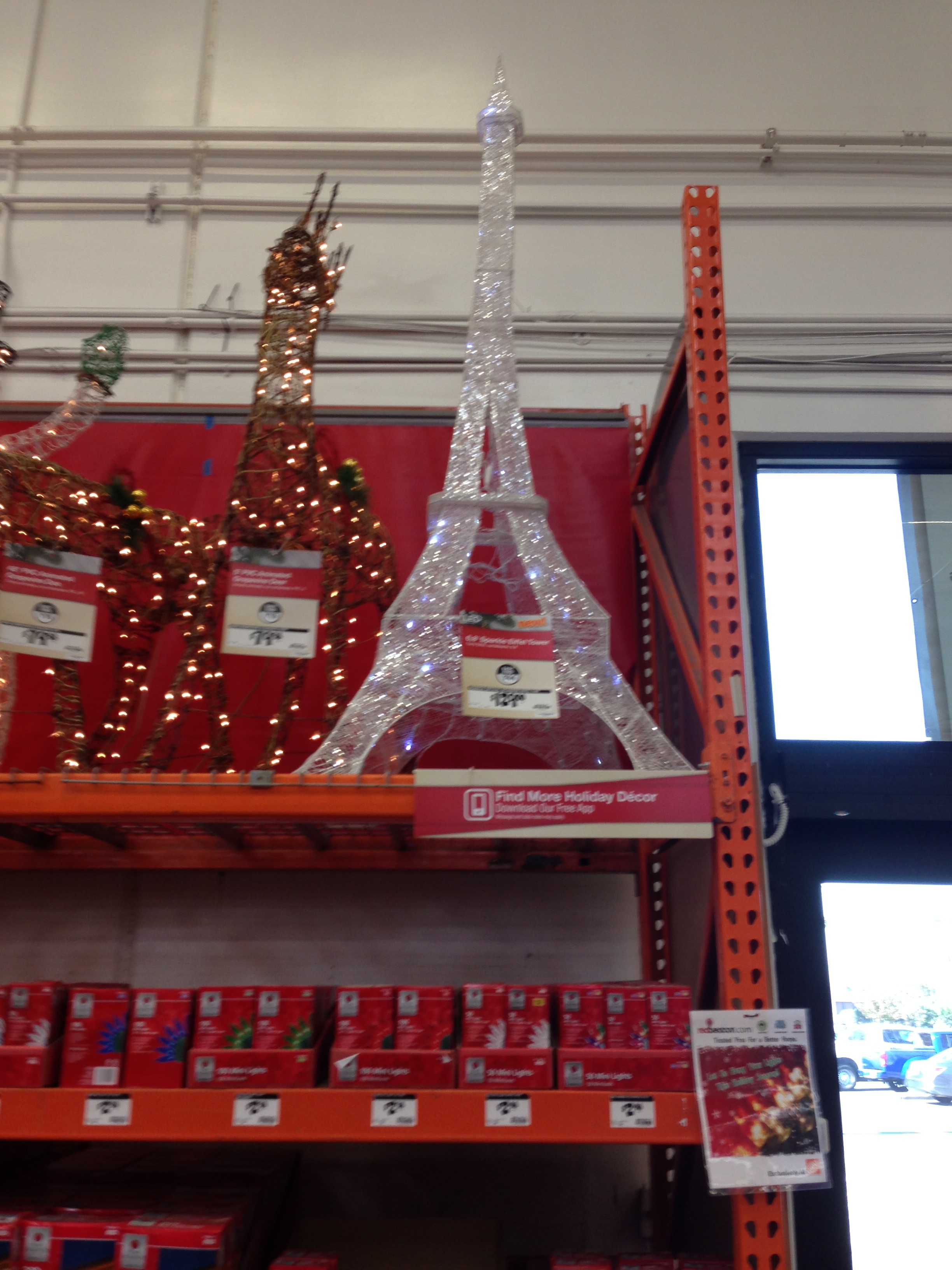 I am a huge Eiffel Tower fan (we went to Paris for our honeymoon). What I am not a fan of at my own house (although I love visiting other extravagant displays ) are Christmas lights. Seriously, we have the old school big bulbs out on our house and that is it! But I saw this and wondered if I was crazy thinking that I HAD TO have it. I texted a few friends this photo and they agreed that I did. They asked how big it was and I casually replied 4 or 5 feet.